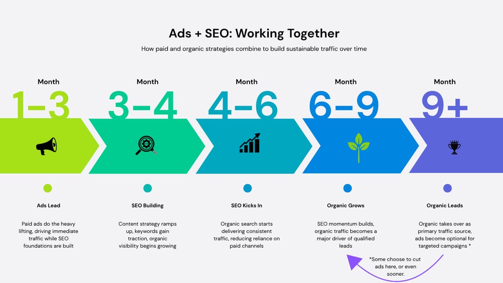 You want to run ads and SEO together. This is the smartest play — ads generate leads while your SEO builds, and eventually organic traffic takes over the heavy lifting.